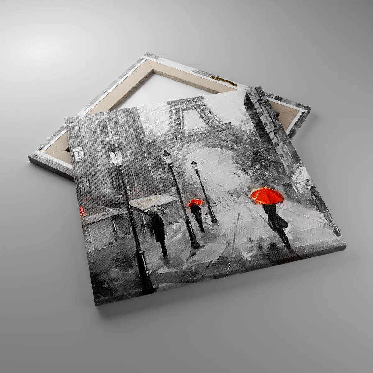 Die Leinwand wird über den Rahmen gespannt. Die Seiten und Kanten werden gedruckt, um das Bild fortzusetzen. Das Bild ist fertig zum Aufhängen an der Wand. Jedes Produkt hat einen am Rahmen befestigten Anhänger und ein Montageset (Schraube + Stift).