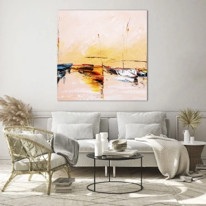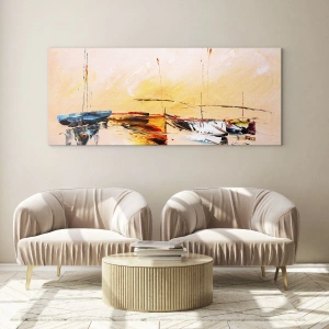 Glasbild - Bild auf glas - Bunte Boote auf ruhigem Wasser bei Sonnenuntergang - 70x100cm - Abend im Yachthafen - Moderne Wanddekoration für Wohnzimmer und Schlafzimmer ARTTOR