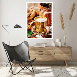 Poster - Eine goldene Tasse Kaffee, umgeben von Bohnen, Krügen und Croissants - 100x70cm - Schönen Tag noch! - Moderne Wanddekoration für Wohnzimmer und Schlafzimmer ARTTOR