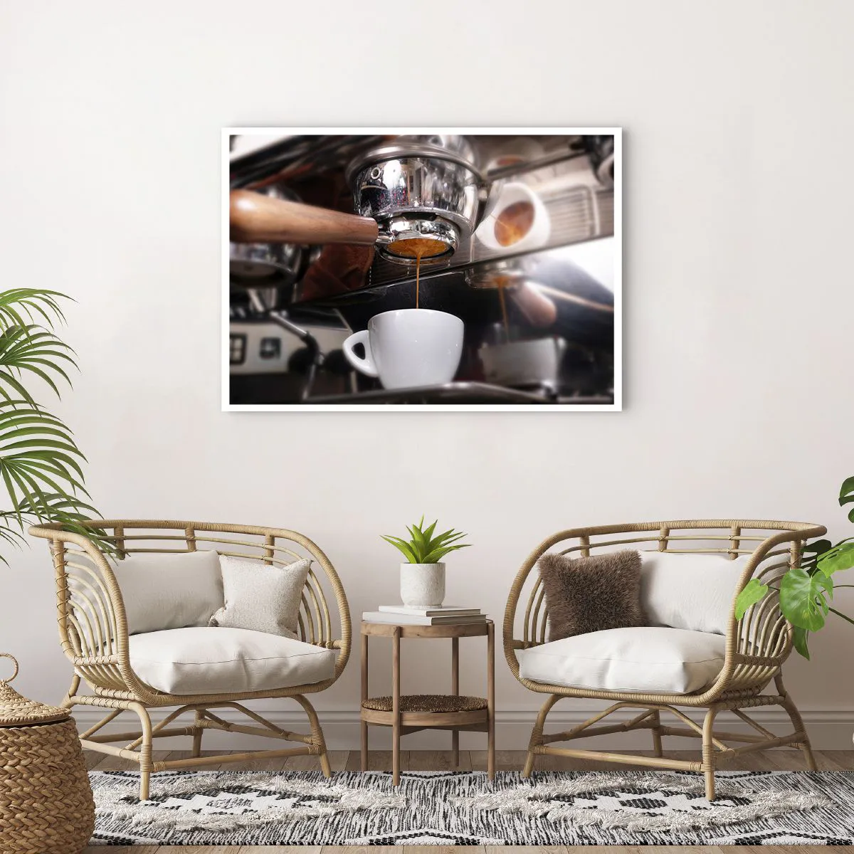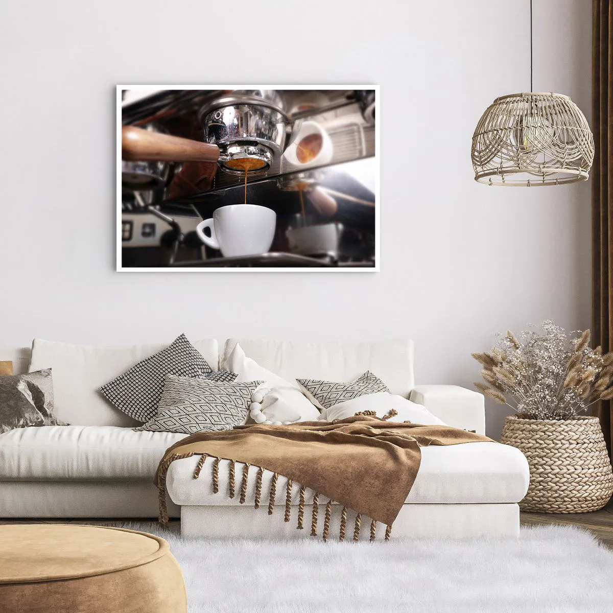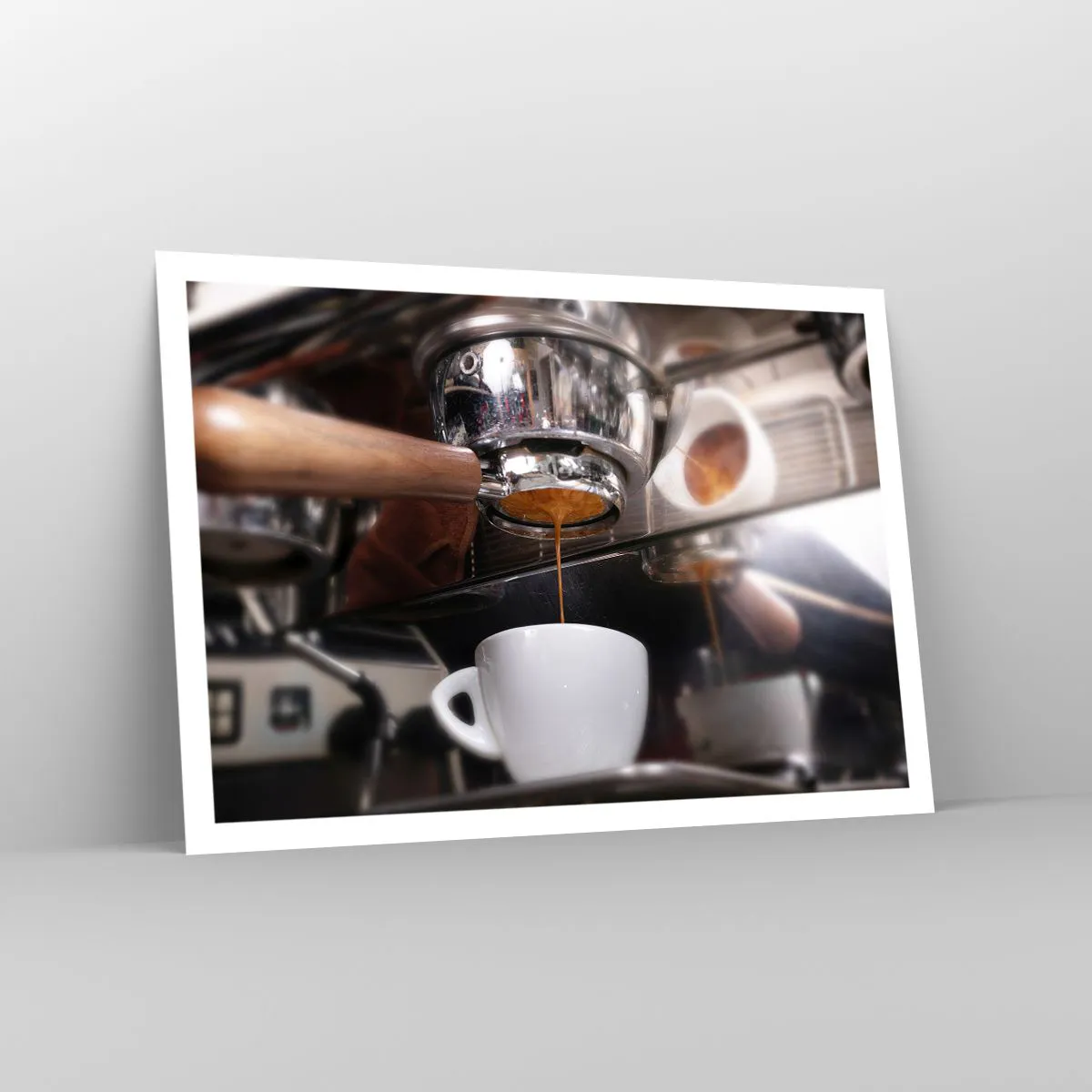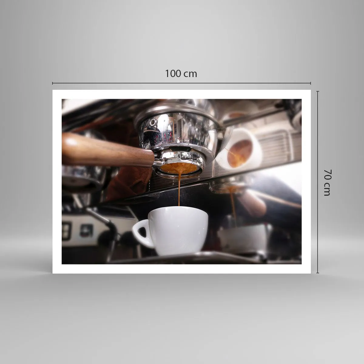 Poster - Nahaufnahme einer Kaffeemaschine, die einen frischen Espresso zubereitet - 100x70cm - Gute Zeit des Tages - Moderne Wanddekoration für Wohnzimmer und Schlafzimmer ARTTOR