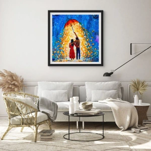 Poster in einem schwarzem Rahmen - Ein Paar unter einem roten Regenschirm im leuchtenden Regen - 70x50cm - Zauber eines Regenabends? - Moderne Wanddekoration für Wohnzimmer und Schlafzimmer ARTTOR