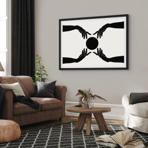 Poster in einem schwarzem Rahmen - Schwarze Hände in einer symmetrischen Komposition mit einer Kugel - 70x50cm - Geheimes Zeichen - Moderne Wanddekoration für Wohnzimmer und Schlafzimmer ARTTOR