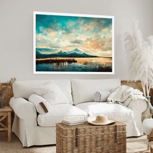 Poster - Eine malerische Landschaft mit einem Berg und einem ruhigen See - 100x70cm - Unter dem Schutz des Himmels - Moderne Wanddekoration für Wohnzimmer und Schlafzimmer ARTTOR