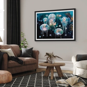 Poster in einem schwarzem Rahmen - Subtile Quallen schwimmen im Meer - 50x70cm - Unterwasserball - Moderne Wanddekoration für Wohnzimmer und Schlafzimmer ARTTOR