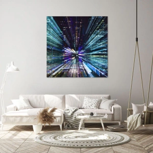 Dieser Leinwanddruck passt perfekt in moderne Innenräume wie Wohnzimmer, Büros oder Geschäftsräume. Seine dynamische Komposition und sein einzigartiges Design verleihen dem Raum eine Atmosphäre der Inspiration, Energie und des urbanen Stils. Es ist ein ideales Angebot für Liebhaber von Architektur, Technologie und zeitgenössischer Kunst.