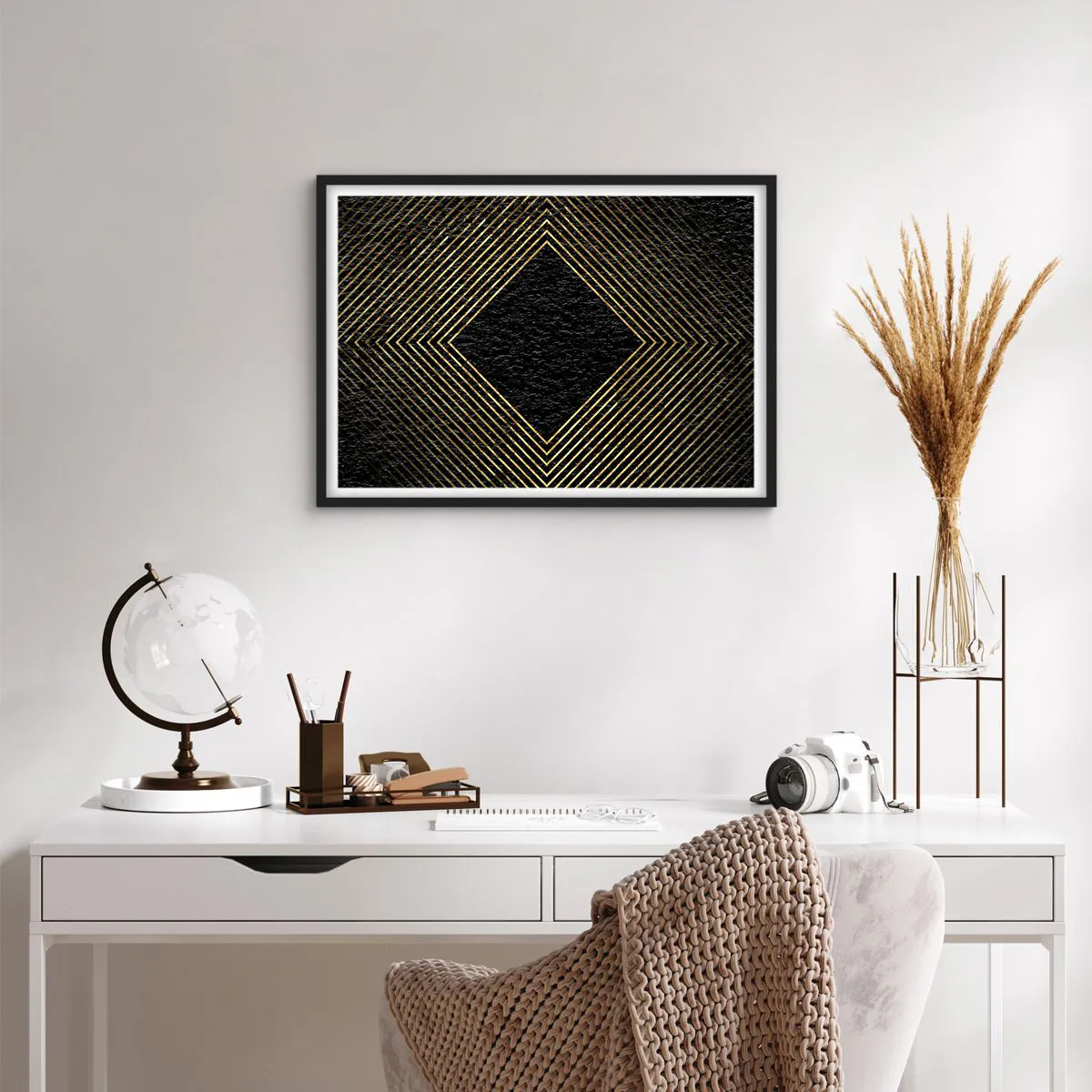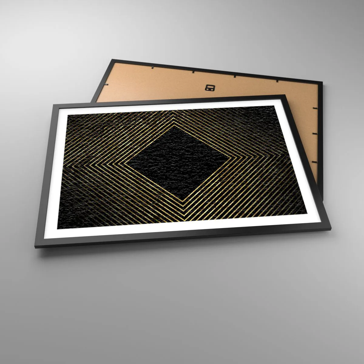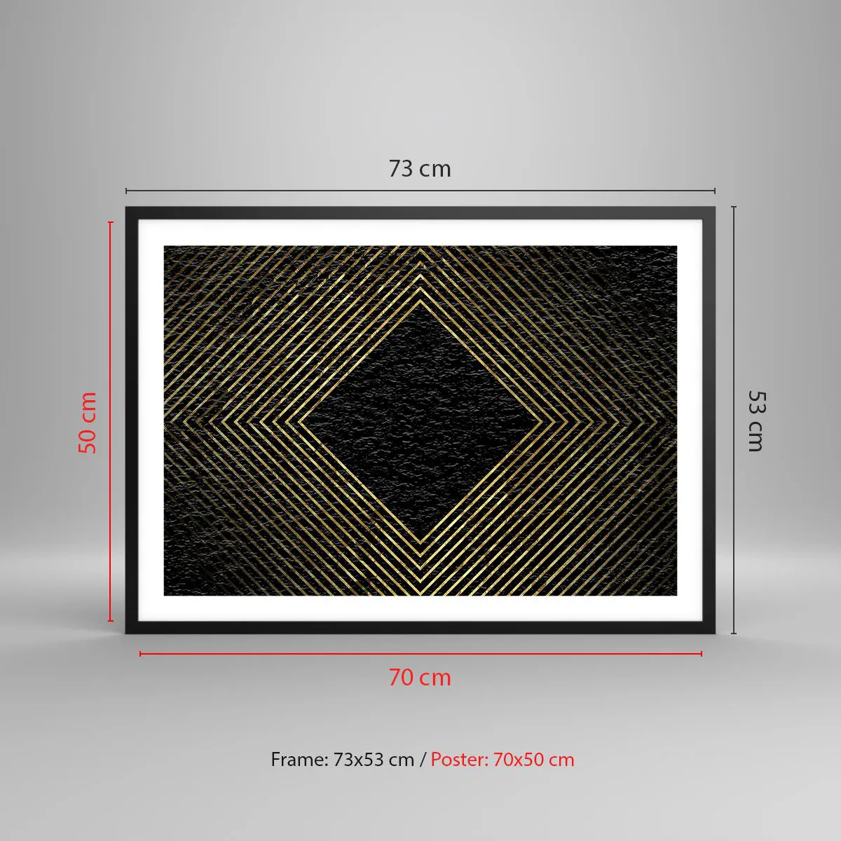 Poster in einem schwarzem Rahmen - Schwarzer Hintergrund mit einem geometrischen Muster aus goldenen Linien - 70x50cm - Geometrie im glamourösen Stil - Moderne Wanddekoration für Wohnzimmer und Schlafzimmer ARTTOR