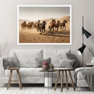 Poster - Pferde galoppieren in der Wüste im warmen Licht des Sonnenuntergangs - 50x70cm - Frei wie der Wind - Moderne Wanddekoration für Wohnzimmer und Schlafzimmer ARTTOR