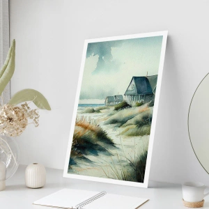 Poster - Ein Haus am Meer, umgeben von Gras und mit Blick auf das Meer - 100x70cm - Abseits vom Trubel - Moderne Wanddekoration für Wohnzimmer und Schlafzimmer ARTTOR
