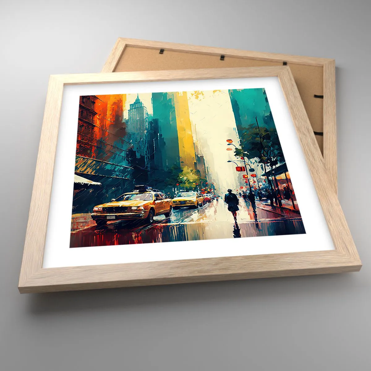Poster in einem Rahmen aus heller Eiche - New York – selbst der Regen ist hier bunt - 30x30 cm