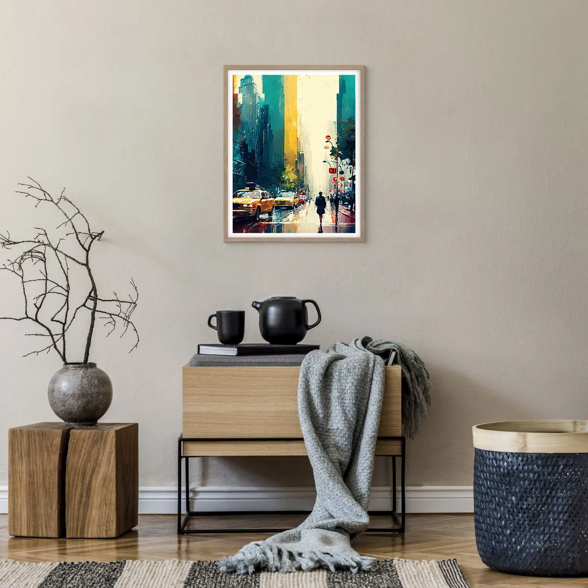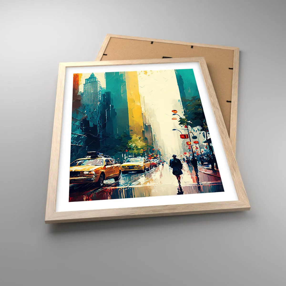 Poster in einem Rahmen aus heller Eiche - New York – selbst der Regen ist hier bunt - 40x50 cm