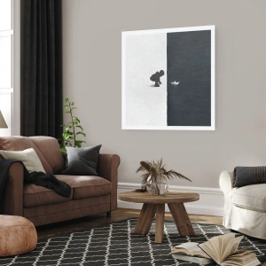 Poster - Eine Kinderfigur mit einem Papierboot vor einem Hintergrund aus kontrastierenden Hälften - 100x70cm - Tolle Expedition - Moderne Wanddekoration für Wohnzimmer und Schlafzimmer ARTTOR