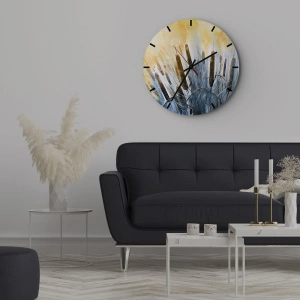 Wanduhr „Kaltes Wasser, Wärme der Sonne“ ist eine von der Natur inspirierte künstlerische Komposition, die Schilfrohr im Licht der untergehenden Sonne darstellt. Das Gemälde wurde in einem malerischen Stil geschaffen, der an Aquarell erinnert, was ihm Weichheit und Subtilität verleiht.