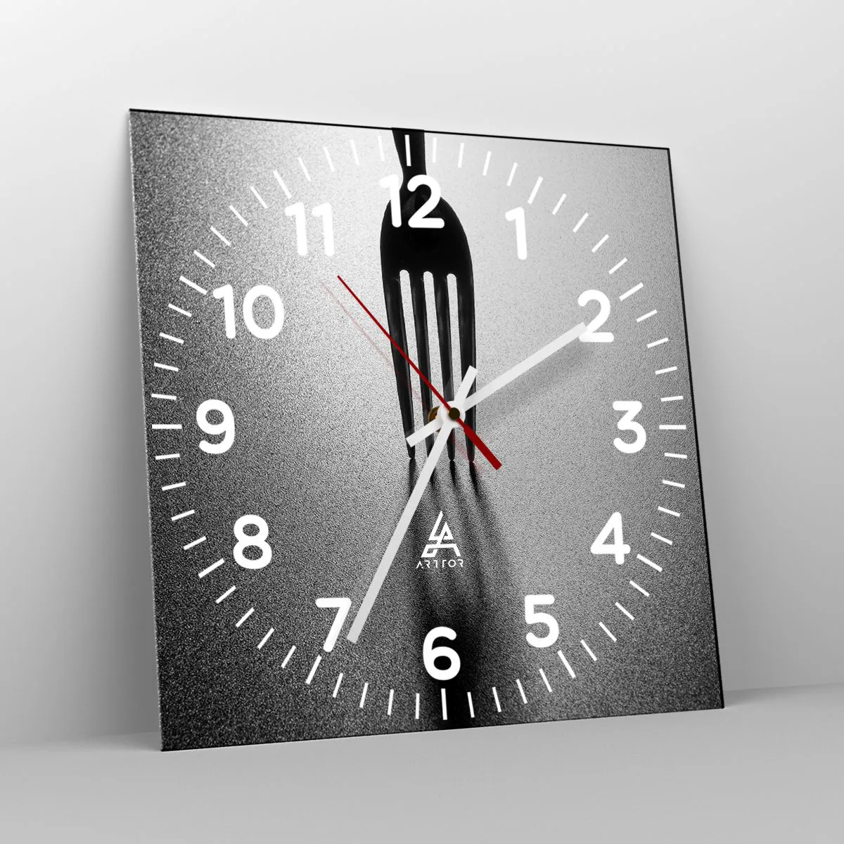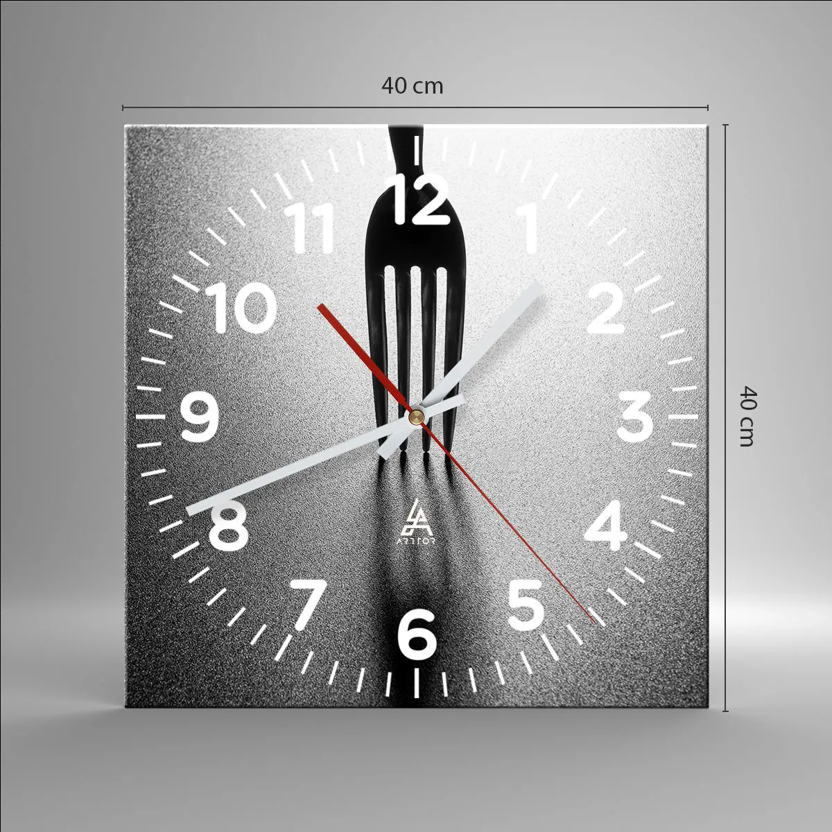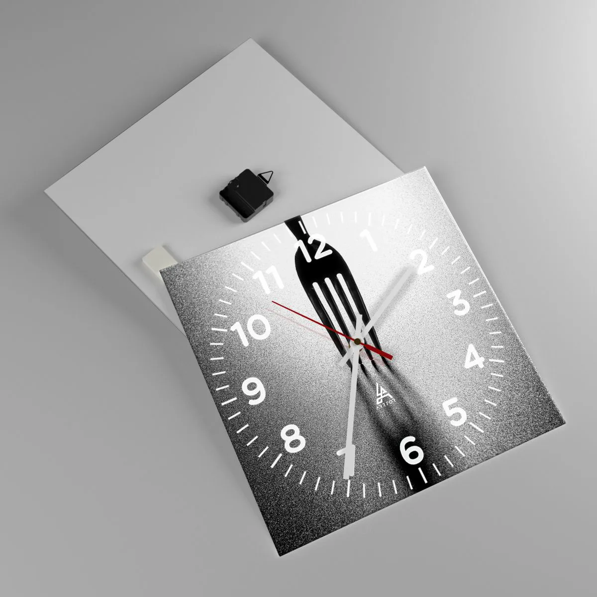 Die Uhr besteht aus 4 mm dickem Sicherheitsglas Glas. Die Herstellungstechnologie der Uhr entspricht der Sicherheitsklasse 2B2 gemäß der Norm PN-EN 12600: 2004, die Stoßfestigkeit garantiert. Die Uhr auf dem Glas ist bereit zu hängen - es hat einen Metallanhänger, einen Anhänger auf der Rückseite der Uhr und einen Schaumstoffabstand, der einen gleichmäßigen Abstand zwischen der Uhr und der Wand reguliert. Die Uhr hat einen geräuschlosen Schwimmmechanismus, der von einer 1,5-V-Batterie betrieben wird - AA-Batterie inbegriffen).