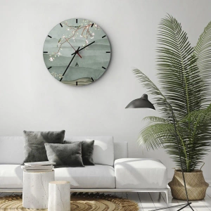 Wanduhr - Glasuhr - Ein malerisches Bild eines blühenden Baumzweigs mit Vögeln vor dem Hintergrund grüner Hügel. - 30x30cm - Frühling, oh, du bist es - Moderne Wanddekoration für Wohnzimmer und Schlafzimmer ARTTOR