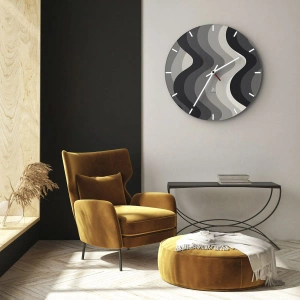 • Eine Wanduhr mit einem grafischen Motiv aus wellenförmigen Streifen in Schwarz-, Grau- und Weißtönen. Dieses moderne, minimalistische Design passt perfekt zu Räumen mit einer ruhigen und aufgeräumten Atmosphäre.