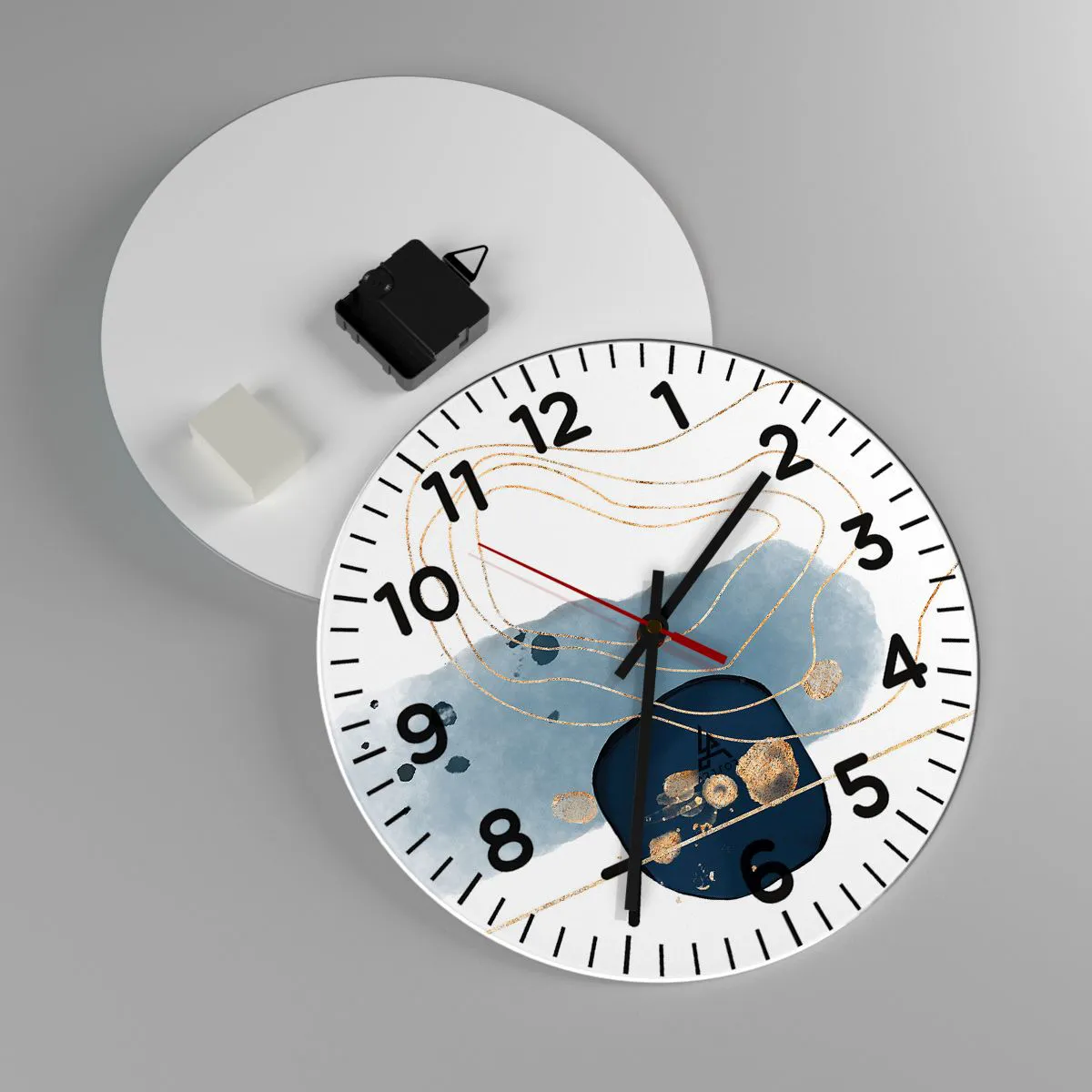 Die Uhr besteht aus 4 mm dickem Sicherheitsglas Glas. Die Herstellungstechnologie der Uhr entspricht der Sicherheitsklasse 2B2 gemäß der Norm PN-EN 12600: 2004, die Stoßfestigkeit garantiert. Die Uhr auf dem Glas ist bereit zu hängen - es hat einen Metallanhänger, einen Anhänger auf der Rückseite der Uhr und einen Schaumstoffabstand, der einen gleichmäßigen Abstand zwischen der Uhr und der Wand reguliert. Die Uhr hat einen geräuschlosen Schwimmmechanismus, der von einer 1,5-V-Batterie betrieben wird - AA-Batterie inbegriffen).