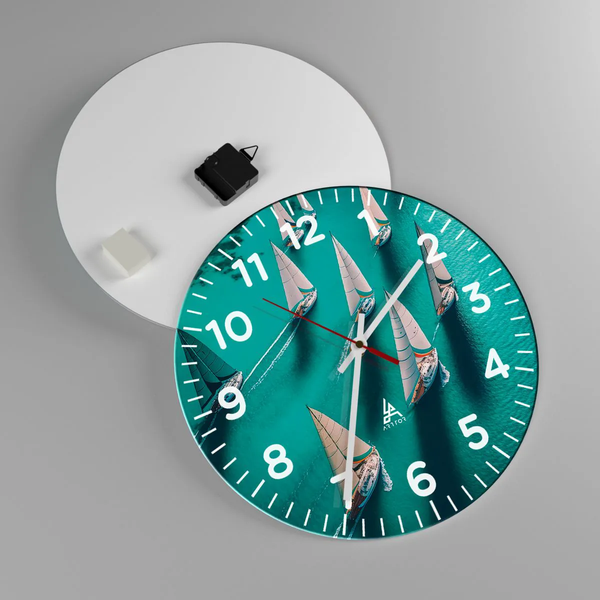 Die Uhr besteht aus 4 mm dickem Sicherheitsglas Glas. Die Herstellungstechnologie der Uhr entspricht der Sicherheitsklasse 2B2 gemäß der Norm PN-EN 12600: 2004, die Stoßfestigkeit garantiert. Die Uhr auf dem Glas ist bereit zu hängen - es hat einen Metallanhänger, einen Anhänger auf der Rückseite der Uhr und einen Schaumstoffabstand, der einen gleichmäßigen Abstand zwischen der Uhr und der Wand reguliert. Die Uhr hat einen geräuschlosen Schwimmmechanismus, der von einer 1,5-V-Batterie betrieben wird - AA-Batterie inbegriffen).