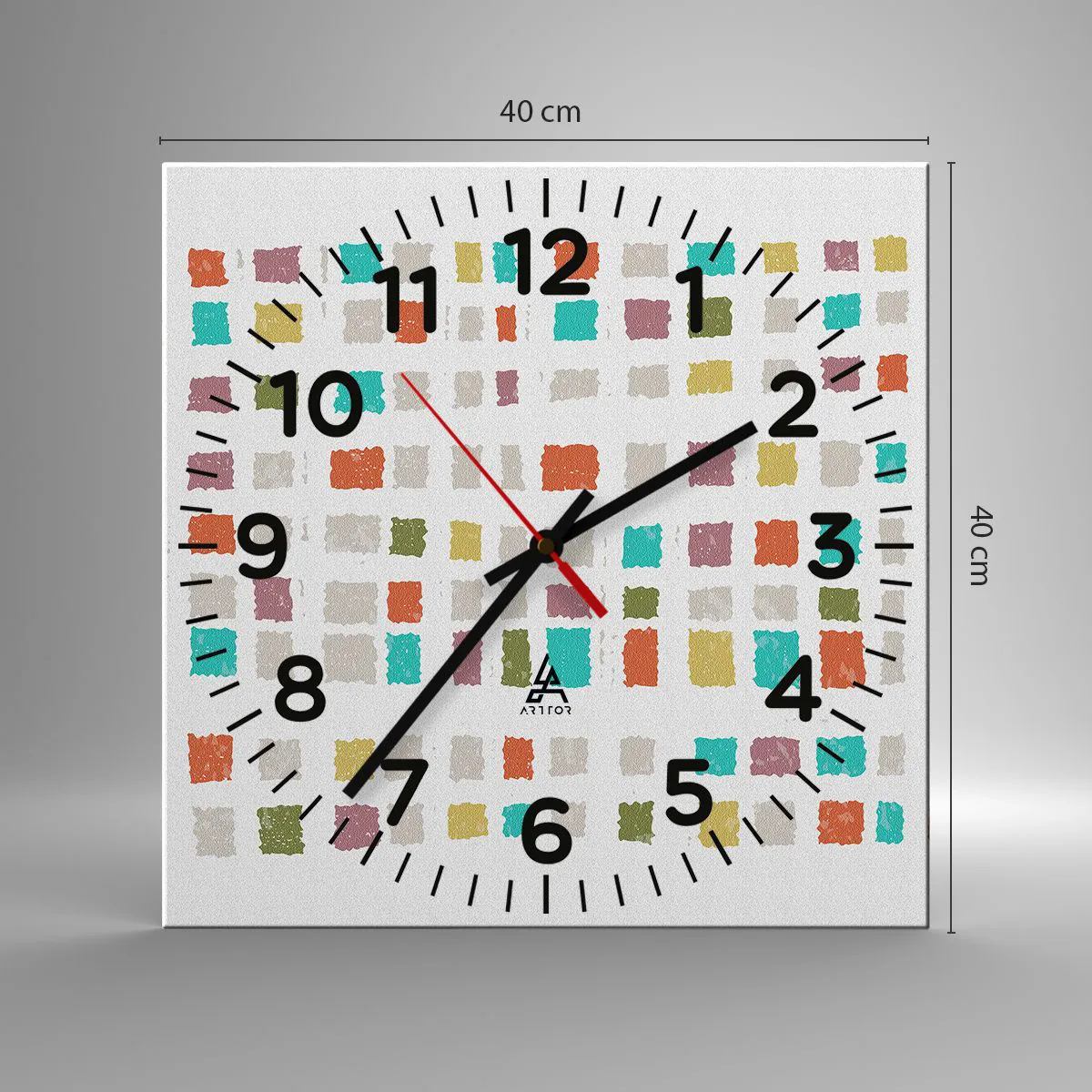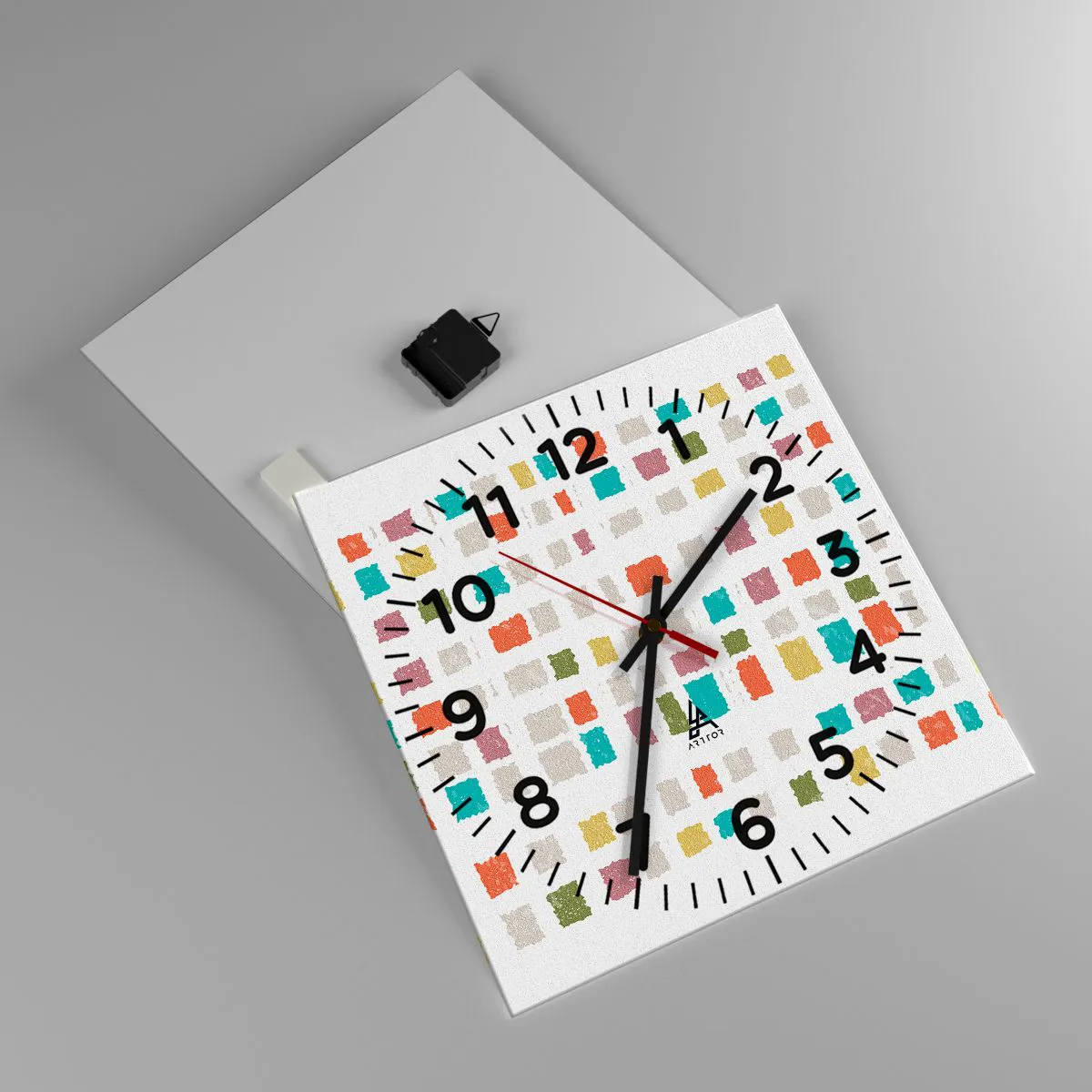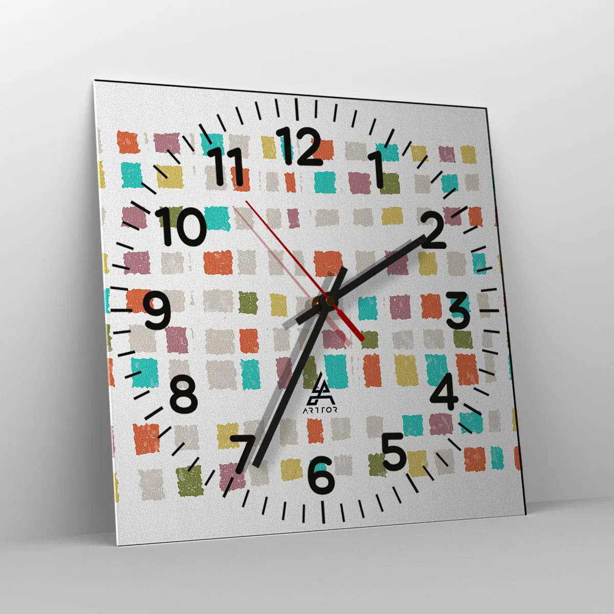 Die Uhr besteht aus 4 mm dickem Sicherheitsglas Glas. Die Herstellungstechnologie der Uhr entspricht der Sicherheitsklasse 2B2 gemäß der Norm PN-EN 12600: 2004, die Stoßfestigkeit garantiert. Die Uhr auf dem Glas ist bereit zu hängen - es hat einen Metallanhänger, einen Anhänger auf der Rückseite der Uhr und einen Schaumstoffabstand, der einen gleichmäßigen Abstand zwischen der Uhr und der Wand reguliert. Die Uhr hat einen geräuschlosen Schwimmmechanismus, der von einer 1,5-V-Batterie betrieben wird - AA-Batterie inbegriffen).