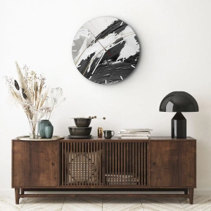 - Diese runde Wanduhr im Format 30 x 30 cm besticht durch eine Komposition aus dynamischen Pinselstrichen in Schwarz-, Weiß- und Grautönen. Ein kraftvoller und moderner dekorativer Akzent.
