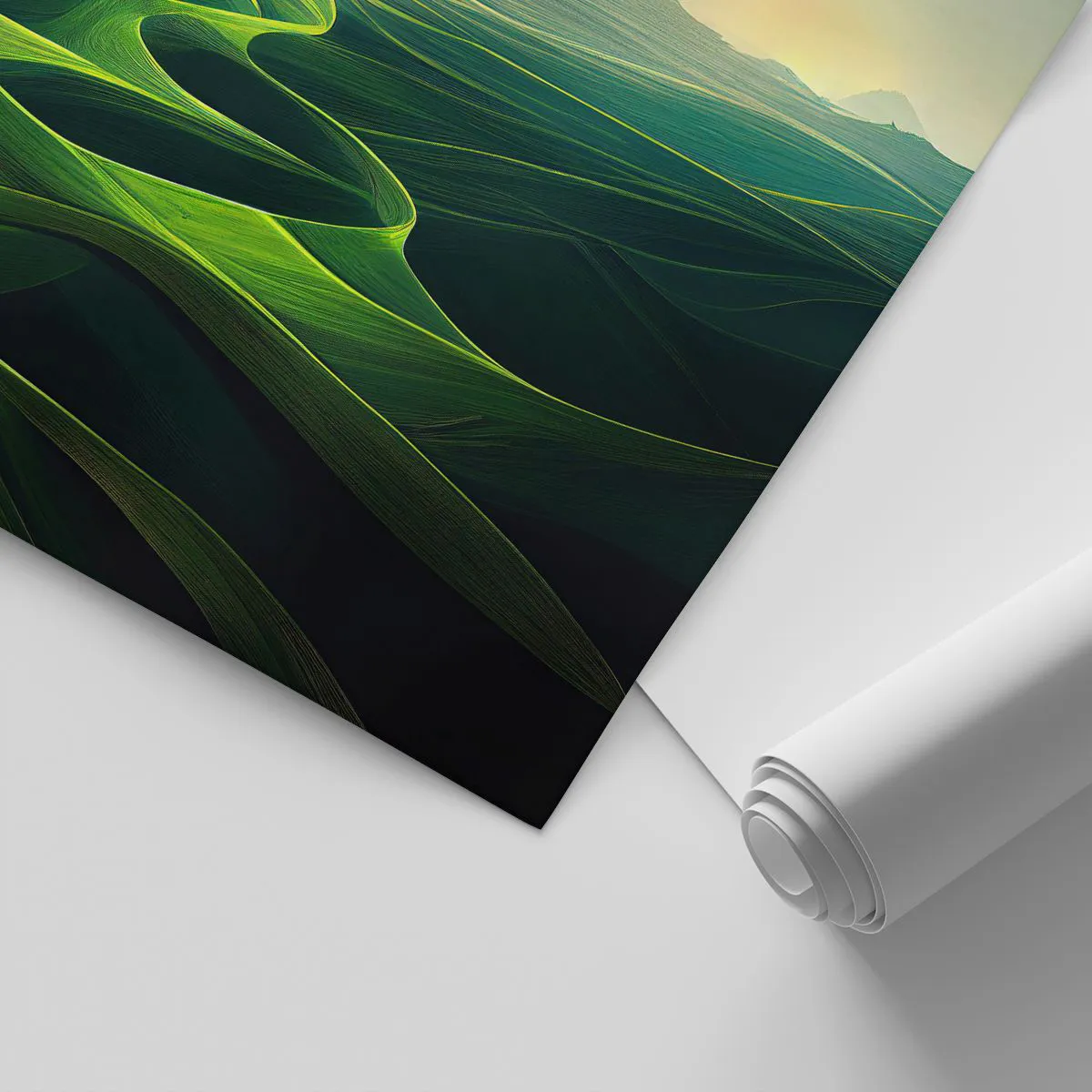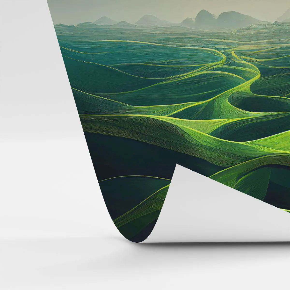 Die dominierende Farbe der Fototapete ist Grün in verschiedenen Schattierungen – von tiefem Smaragdgrün bis zu hellem Limettengrün. In Kombination mit den weichen Linien der Landschaft und dem subtilen Licht entsteht die Illusion von Bewegung und Dreidimensionalität. Die Perspektive der Täler, die sich zum fernen Horizont erstrecken, verstärkt das Gefühl von Tiefe und Weite zusätzlich.