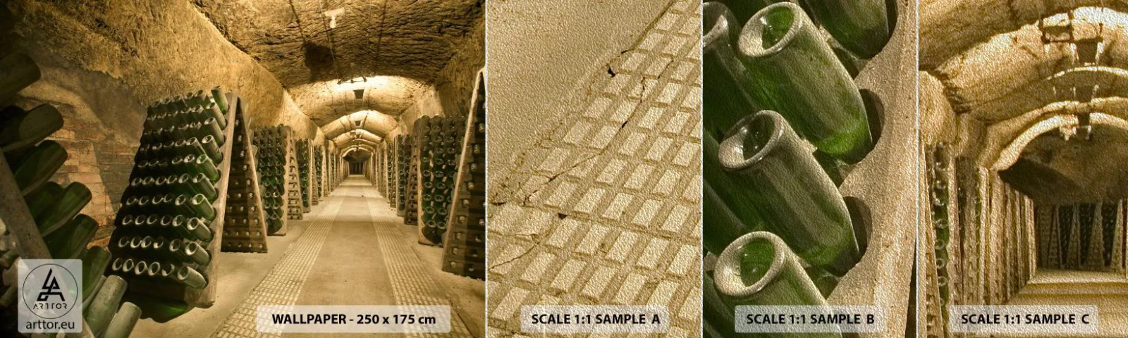 Fototapeten Muster Premium Sand - Die Geburt des Geschmacks - Gastronomie, Eine Flasche Wein, Weinkeller - 100x30 cm