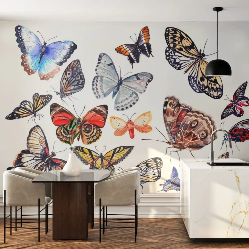 Selbstklebende Fototapete Deluxe Sticker - Spitzen, bunter Schwarm - Für Kinder, Bunte Schmetterlinge, Grafik - 100x70 cm