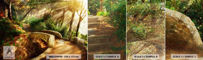 Fototapeten Muster Premium Canvas - Direkt von der Brücke in den Märchenwald - Landschaften, Steintreppen, Sonnenstrahlen - 100x30 cm