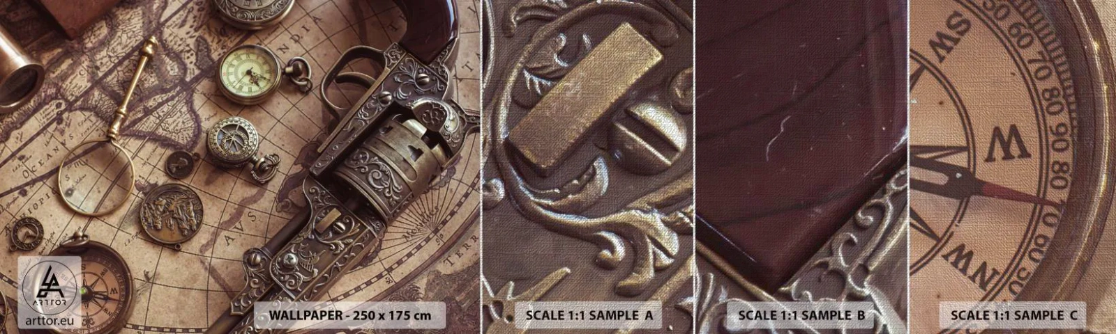 Fototapeten Muster Premium Canvas - Das Abenteuer ruft - Weltkarte, Kompass, Revolver - 100x30 cm