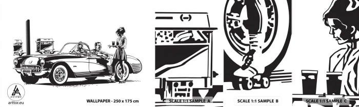 Fototapeten Muster Selbstklebend Deluxe Sticker - 60. - unbeschwertes Amerika - Oldtimer, Tankstelle, Amerika - 100x30 cm