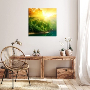 - Dieses Gemälde zeigt einen grünen Wald an einem Fluss, beleuchtet von den Strahlen der aufgehenden Sonne. Eine perfekte Dekoration für Liebhaber der Natur und der Ruhe.