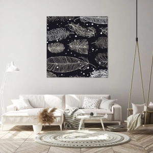 - Dieser Leinwanddruck zeigt zarte weiße Federn, die auf einem marineblauen Hintergrund verstreut sind. Eine perfekte Wahl für alle, die subtile und elegante Dekorationsmotive schätzen.