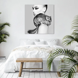 • Frau, Frau mit Chinchilla, Model, Schwarzweiß, Menschen, Mode, Tiere, Für den Flur, für das Wohnzimmer, für das Schlafzimmer, , Grau, Schwarz und Weiß, Quadrat
