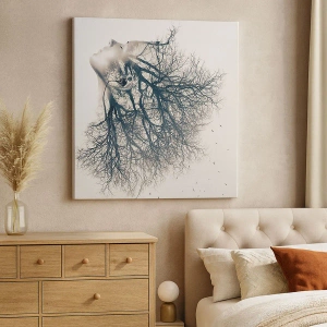 - Ein künstlerisches Gemälde, das die Silhouette einer Frau darstellt, die mit Ästen verschlungen ist. Eine minimalistische und symbolische Komposition, die jedem Interieur Inspiration und Harmonie verleiht.