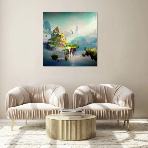 - Dieses Glasgemälde stellt die magische Welt schwimmender Inseln mit Wasserfällen, Regenbögen und umgebenden Wolken dar. Es ist die perfekte Dekoration, um jedem Interieur eine Atmosphäre der Fantasie und des märchenhaften Charmes zu verleihen.