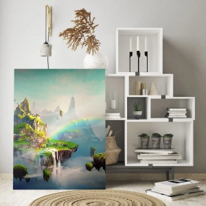 Der Mittelpunkt der Komposition ist eine majestätische Insel mit malerischen Gebäuden und üppigem Grün. Wasserfälle, die von ihren Rändern herabfließen, verleihen Dynamik und ein Gefühl von Bewegung, während die umgebenden Wolken und ein sanfter Regenbogen dem Ganzen Leichtigkeit und einen magischen Charakter verleihen. Im Hintergrund erstrecken sich Inseln und Berge bis zum Horizont und schaffen eine unvergessliche Landschaft.