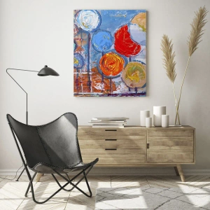 Ein Glaskunstdruck mit bunten, abstrakten Bäumen, gemalt gegen den Himmel, ist eine einzigartige Dekoration, die Farbharmonie und künstlerischen Ausdruck in den Innenraum bringt. Lebendige Farben und dynamische Linien machen das Gemälde zum Blickfang in jedem Raum und verbreiten Freude und Kreativität.
