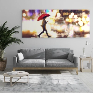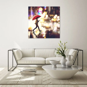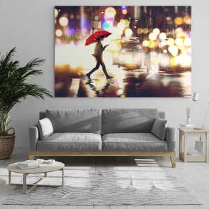 Glasbild - Bild auf glas - Eine Figur mit einem roten Regenschirm auf einer verregneten Straße in der Nacht - 120x80cm - Und doch sonnig - Moderne Wanddekoration für Wohnzimmer und Schlafzimmer ARTTOR
