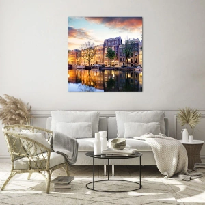 Glasbild - Bild auf glas - Amsterdamer Kanal bei Sonnenuntergang mit Spiegelbild im Wasser - 70x50cm - Zurückhaltende und gelassene niederländische Schönheit - Moderne Wanddekoration für Wohnzimmer und Schlafzimmer ARTTOR