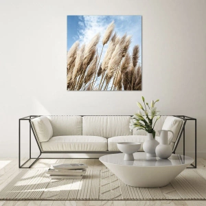 Glasbild - Bild auf glas - Dekorative Pampasgräser vor blauem Himmel - 50x70cm - Sonnige und windige Liebkosungen - Moderne Wanddekoration für Wohnzimmer und Schlafzimmer ARTTOR