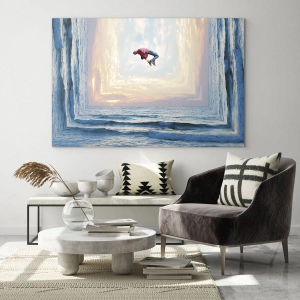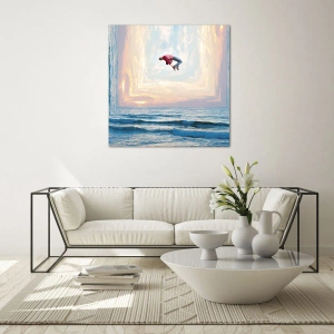 Glasbild - Bild auf glas - Ein Mann springt über das Meer in einem surrealistischen Rahmen - 70x50cm - In eine andere Dimension - Moderne Wanddekoration für Wohnzimmer und Schlafzimmer ARTTOR