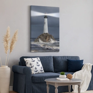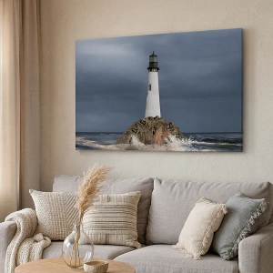 Bild auf Leinwand - Leinwandbild - Ein Leuchtturm auf einem Felsen, umgeben von stürmischer See - 70x50cm - Hier... hier... hier! - Moderne Wanddekoration für Wohnzimmer und Schlafzimmer ARTTOR