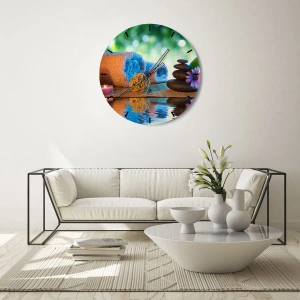 "{title_spa}" ist eine einzigartige Wanduhr, die uns in eine Atmosphäre der Entspannung und Harmonie versetzt. Das Motiv zeigt eine Spa-Komposition mit Steinen, Handtuch und Kerze vor einer malerischen Naturkulisse. Dieses kunstvolle Muster bringt Ruhe und Ästhetik in den Innenraum und passt perfekt zu Zen-inspirierten Räumen.