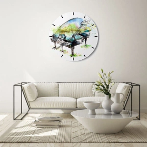 - Diese Wanduhr zeigt ein Klaviermotiv und eine Landschaft im Aquarellstil im Hintergrund. Perfekt für Musik- und Kunstliebhaber, verleiht sie jedem Interieur Eleganz und Harmonie.