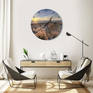 • Diese runde Wanduhr zeigt einen Strand und Dünen bei Sonnenuntergang. Eine dezente und elegante Ergänzung für naturinspirierte Innenräume.