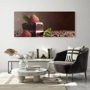 Glasbild - Bild auf glas - Schokoladenkuchen mit Himbeeren und Minze auf einem Hintergrund aus Kakaobohnen - 120x50cm - Das Leben ist süß - Moderne Wanddekoration für Wohnzimmer und Schlafzimmer ARTTOR