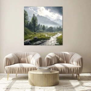 Glasbild - Bild auf glas - Eine Berglandschaft mit einem Bach und einem grünen Tal am Morgen - 50x70cm - Hin und zurück - Moderne Wanddekoration für Wohnzimmer und Schlafzimmer ARTTOR