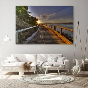 Glasbild - Bild auf glas - Holzsteg bei Sonnenuntergang - 70x50cm - Gehen, weiter der Sonne entgegengehen - Moderne Wanddekoration für Wohnzimmer und Schlafzimmer ARTTOR