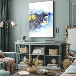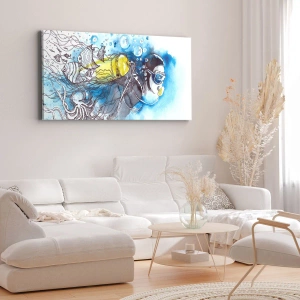 Bild auf Leinwand - Leinwandbild - Unterwasserszene mit einem Taucher und exotischen Fischen - 120x80cm - Tolles Blau - Moderne Wanddekoration für Wohnzimmer und Schlafzimmer ARTTOR