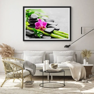 Poster in einem schwarzem Rahmen - Lila Orchidee, schwarze Steine und Bambus in einer ruhigen Komposition - 70x50cm - In ruhiger Balance - Moderne Wanddekoration für Wohnzimmer und Schlafzimmer ARTTOR