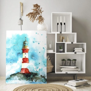 Glasbild - Bild auf glas - Ein Leuchtturm, umgeben von Meereswellen im Aquarellstil - 70x50cm - Einheit der Elemente - Moderne Wanddekoration für Wohnzimmer und Schlafzimmer ARTTOR